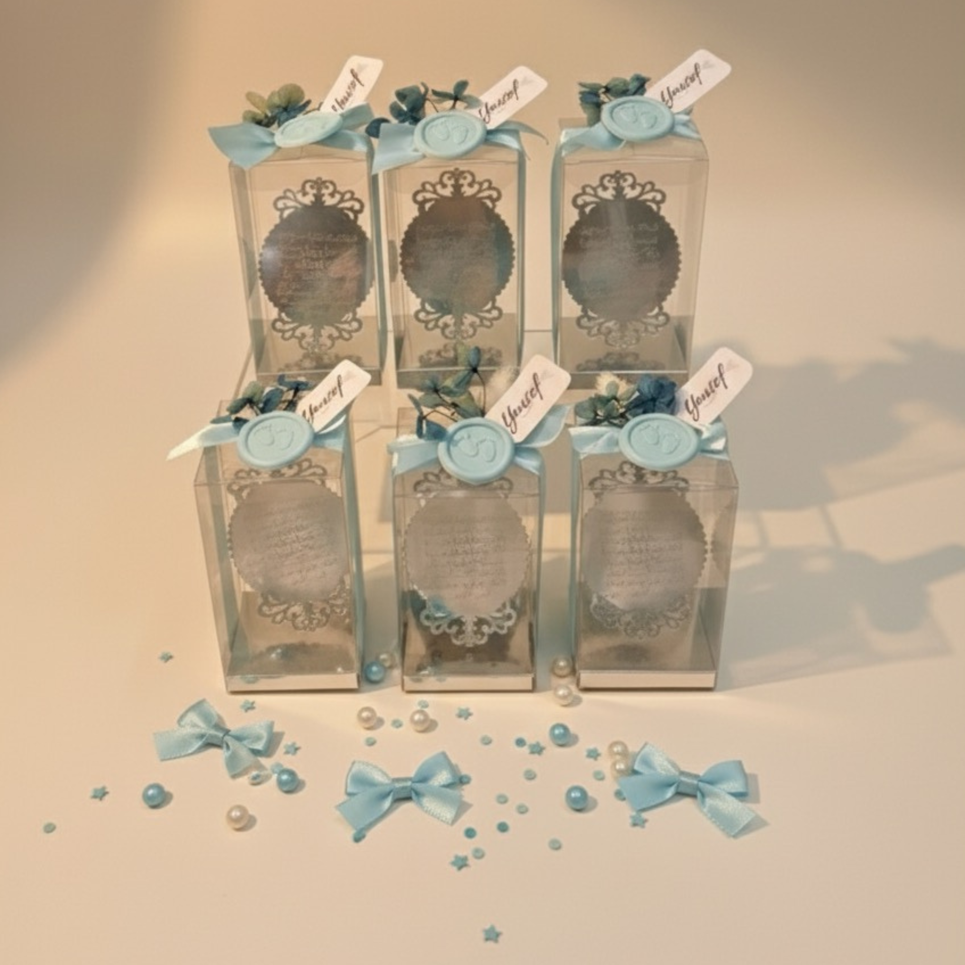 Elegant Ayat Al-Kursi favors engraved on a premium acrylic piece with a fridge magnet, paired with two pieces of fine luxury chocolate — a meaningful and refined gift for any occasion.