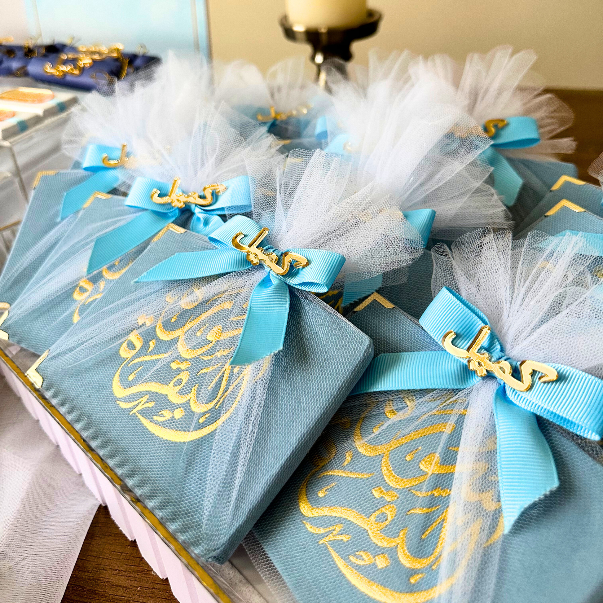 An elegant blue Surah Al-Baqarah booklet, beautifully wrapped in tulle and customized with a name upon request. A meaningful and refined gift suitable for special occasions, favors, or personal use.